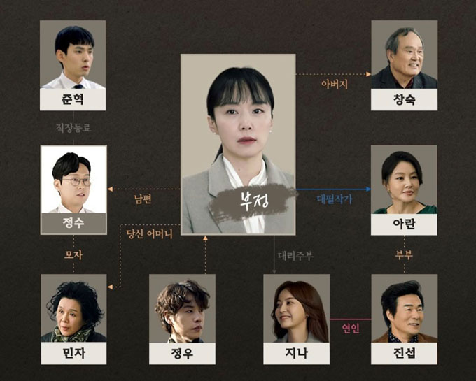 전도연은 극 중 작가가 되고 싶었던 대필작가 부정 역을 맡았습니다. 부정은 최선을 다해 걸어왔으나 인생의 내리막길 위에서 실패한 자신과 마주하며 삶의 이유를 잃어버린 인물입니다.